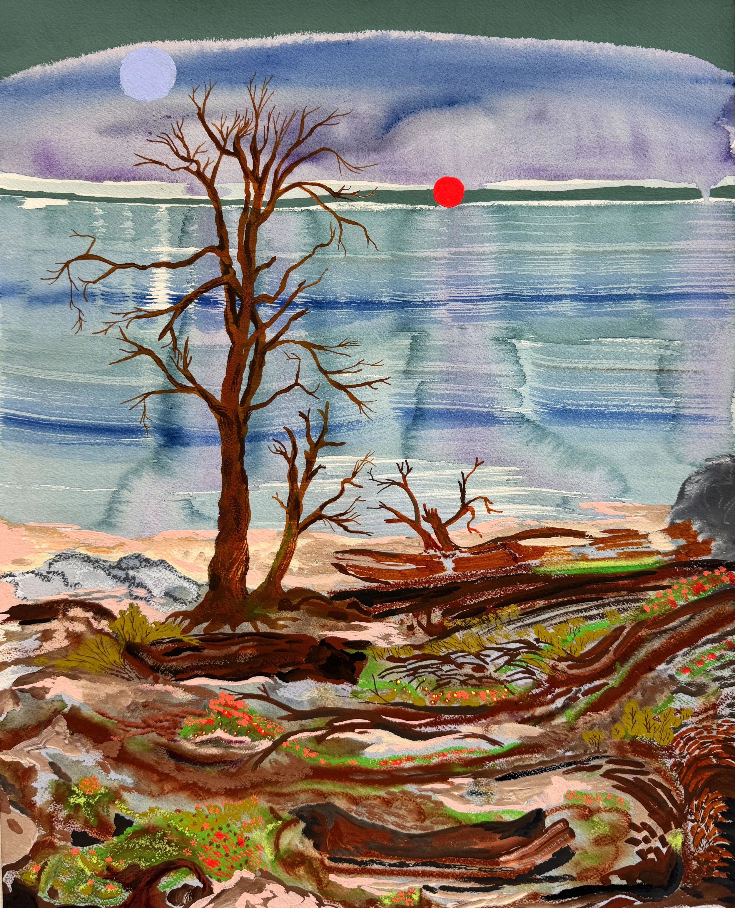 Joshua tree in desert. 14x20 inches, mixed media on paper, 2025
